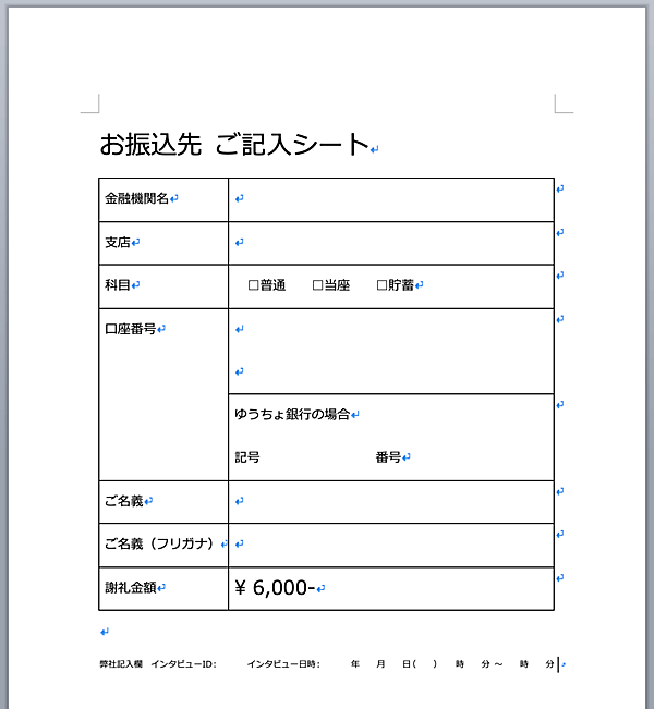 謝礼のお支払いは銀行振込となります。添付ファイルに「ご記入」してご用意ください。
