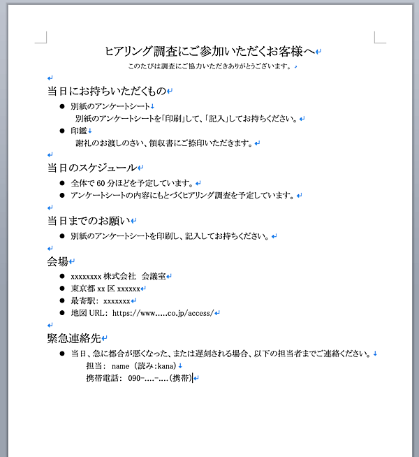 対象者へ持ち物と会場を案内するメールの例(ご来社いただく場合)
