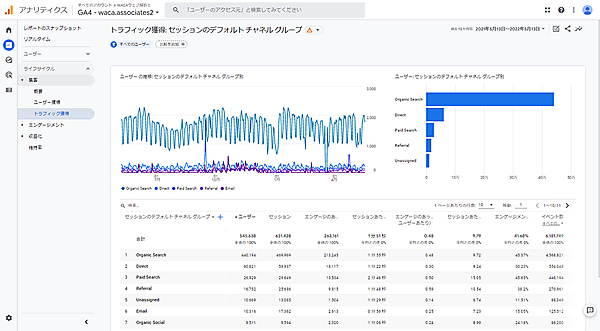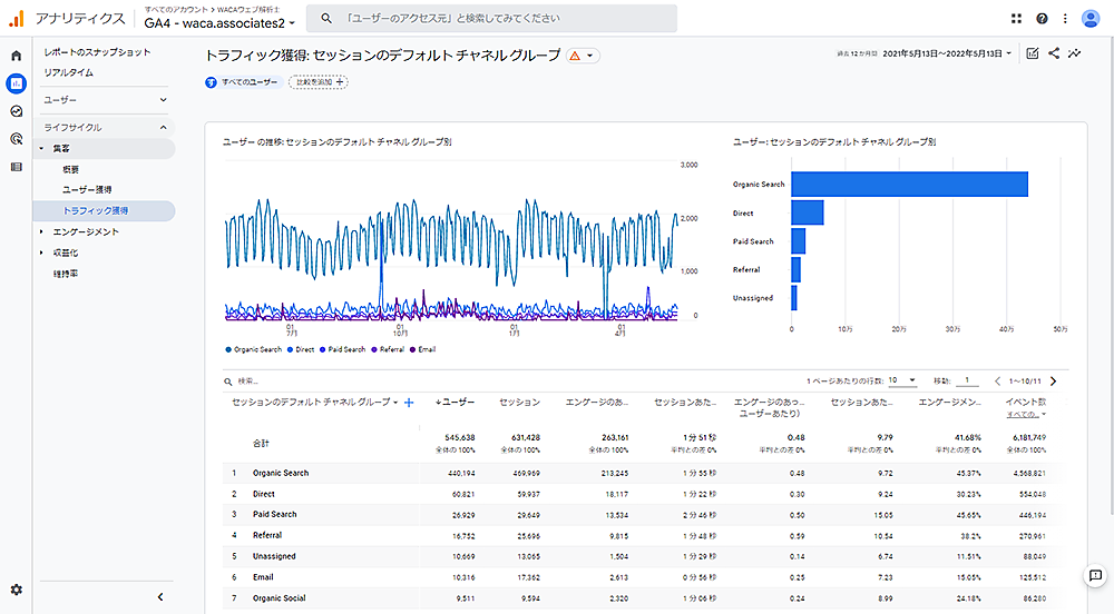 「ライフサイクル>集客>トラフィック獲得」を選択すると、上図のレポートが表示されます。UAの「集客>すべてのトラフィック>チャンネル」で確認していたチャンネル別の獲得セッション数が確認できます。