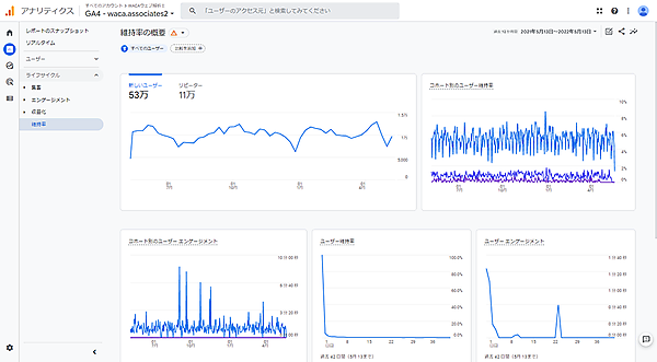 「ライフサイクル>維持率」を選択すると、上図のレポートが表示されます。UAの「ユーザー」内にあるようなコホート別の維持率やユーザータイプを確認できます。