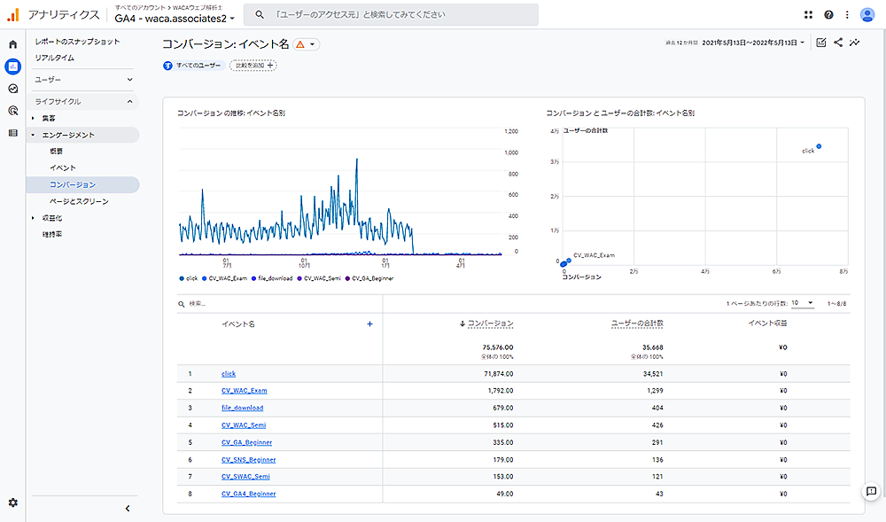 「ライフサイクル>エンゲージメント>コンバージョン」を選択すると、上図のレポートが表示され、コンバージョン数を確認できます。