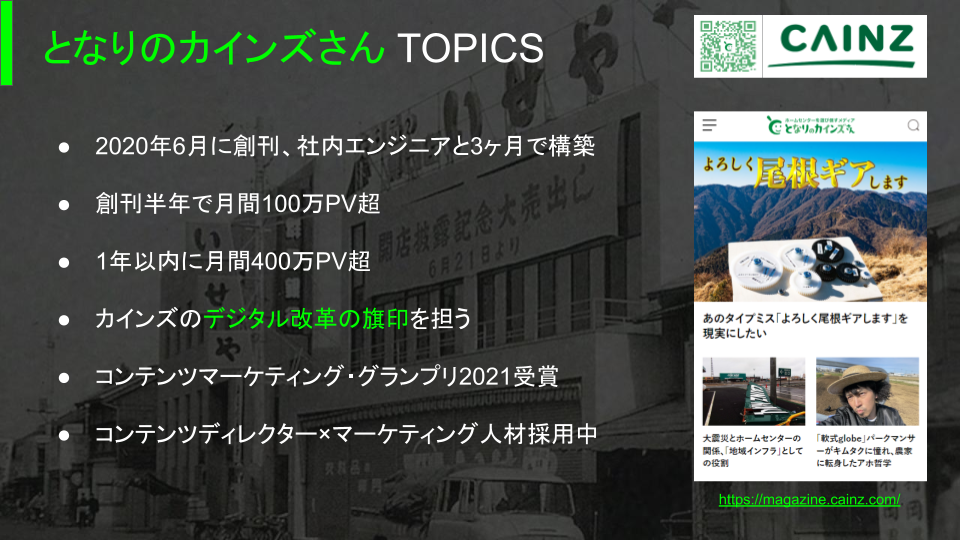 2020年6月に創刊された『となりのカインズさん』は、「社内エンジニアと3ヵ月で構築し、創刊半年で月間100万PV超、1年以内に月間400万PV超を果たした」と清水氏は説明する。いわば同社のデジタル改革の旗印を担うオウンドメディアだが、清水氏によると、ここまでの道のりは決して順風満帆ではなかったという。