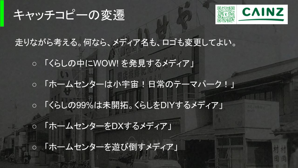 清水氏は「キャッチコピーは走りながら考えることにし、メディア名も、ロゴも変更してよいことにした」と振り返る。キャッチコピーも、「くらしの中にWOW! を発見するメディア」「ホームセンターをDXするメディア」「ホームセンターを遊び倒すメディア」などと変遷してきた。