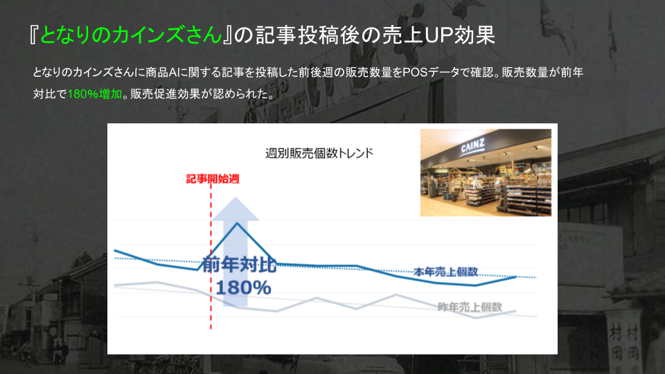 『となりのカインズさん』は売上貢献でも成果を上げている。たとえば、商品Aに関する記事を投稿した前後週の販売数量をPOSデータで確認したところ「販売数量が前年対比で180%増加するなど、販売促進効果が認められた」と清水氏は話す。
