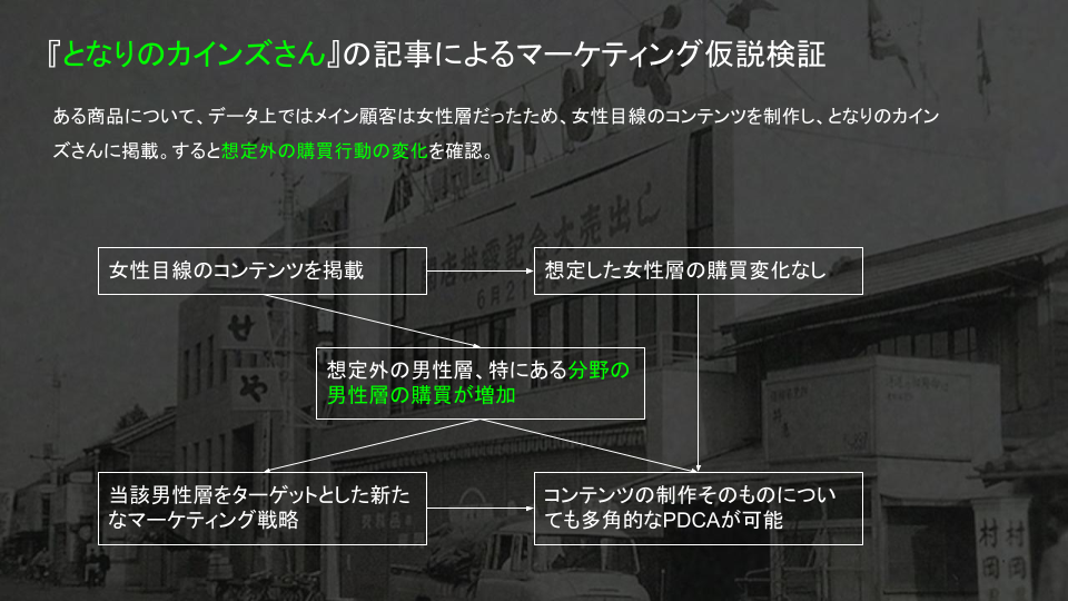 そこで、データによる仮説に基づき、一部の男性層をターゲットにしたマーケティングに変更すれば、記事によるマーケティング仮説検証サイクルが回していけるようになるという。