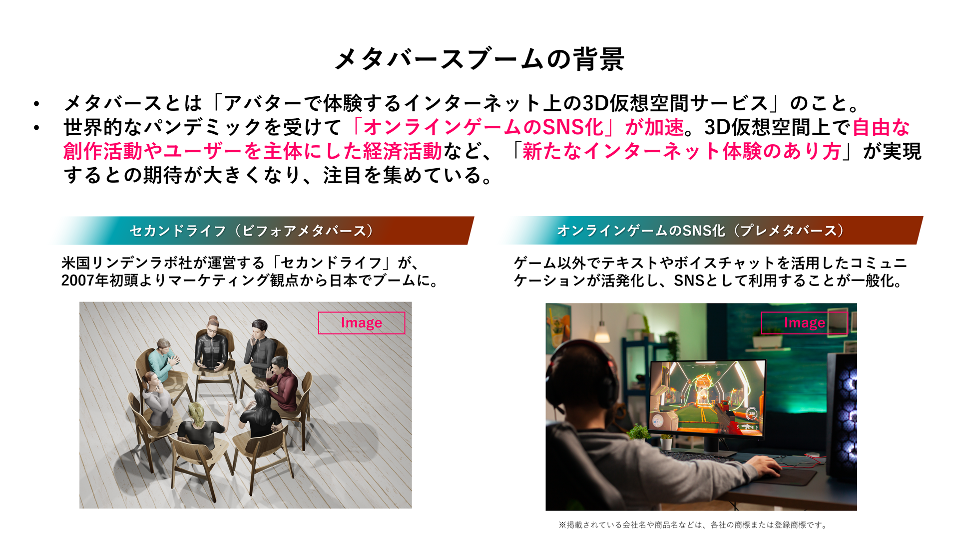 一旦は下火になったものの、その後のオンラインゲームの普及・発展によって3Dのゲーム空間がSNS的に利用される傾向が強まり、その結果として、メタバース的体験が2020年代に定着。加えて、ブロックチェーン技術を軸とする「Web3」によって、制作物や財貨の取引がユーザー間でより自由に行えるようになると見込まれており、メタバースが新しい生活圏・経済圏になり得るとして、改めて注目されている。