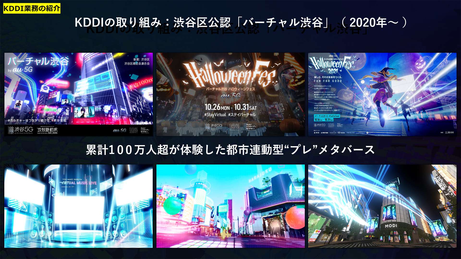 KDDIがメタバースに取り組み始めたのは、2019年の「渋谷エンタメテック推進プロジェクト」がきっかけ。一般社団法人渋谷未来デザイン(渋谷区の外郭団体)、渋谷区観光協会、KDDIによって立ち上げられ、その後、来る5G時代を見据えた新しい体験価値の創出を目的とする「渋谷5Gエンターテイメントプロジェクト」へと発展した。プロジェクトの参加企業は2021年度には73社に達している。