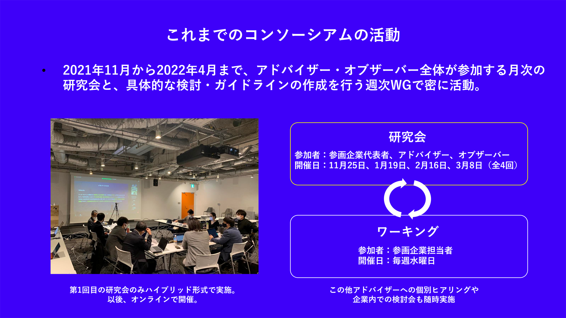 さらにはKDDIとして、メタバースの利用に関するガイドライン策定にも取り組んでいる。三浦氏によれば、メタバースは法律面でのグレーゾーンが少なからずある。たとえばアバターの肖像権や、都市景観をメタバース上で再現する際の利害関係処理なども明確化しなければならない。そこで、専門家や経済産業省などの協力のもとにコンソーシアムを作成し、この4月には、「バーチャルシティ宣言」「バーチャルシティガイドライン ver.1」を提起した。