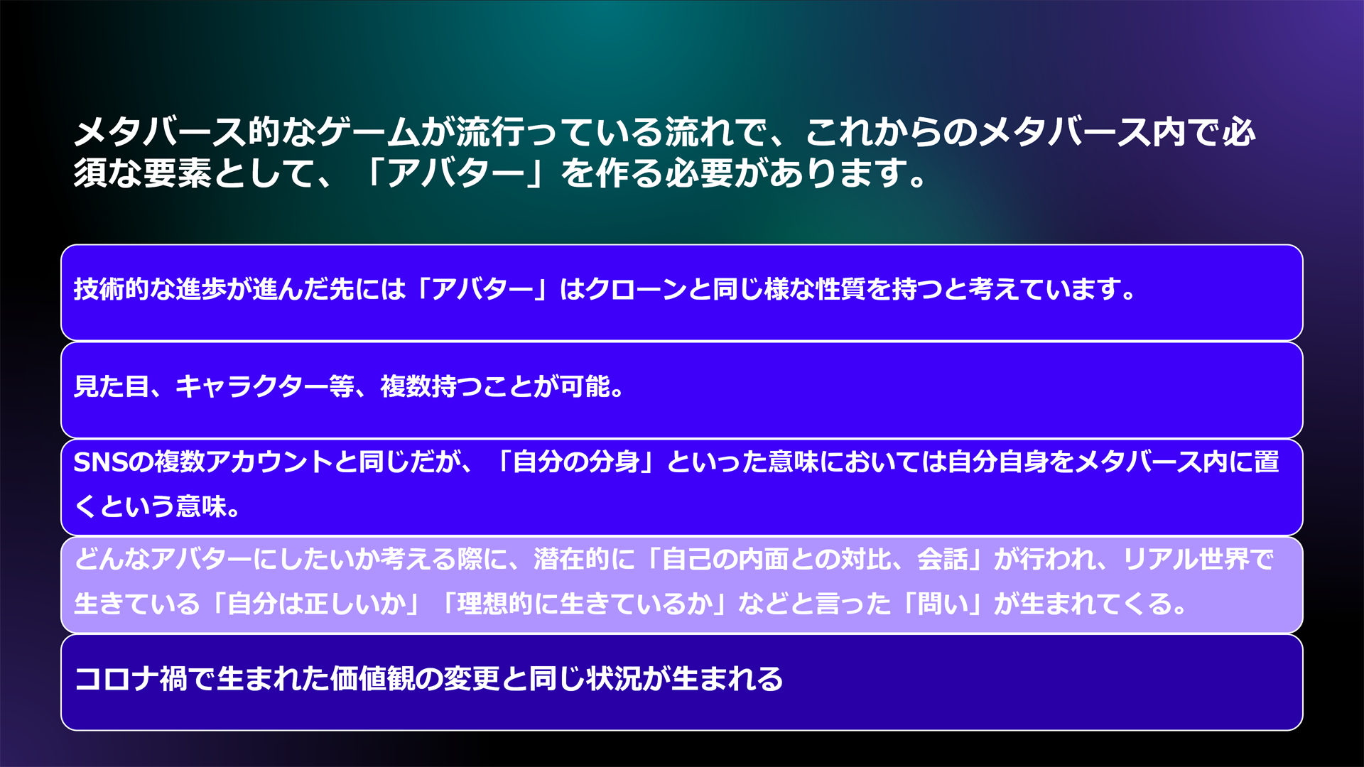どんなアバターにしたいか考えるとき、自己の内面との対比が行われることになり、そこでは『自分が正しいか』『理想的に生きているか』などの問いも生まれるだろう(三浦氏)