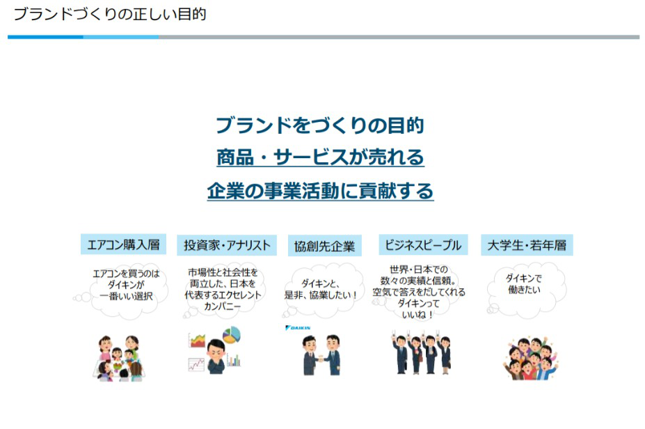 ブランドをつくる目的は『商品・サービスが売れる』『企業の事業活動に貢献する』───これに尽きる。ダイキンであればエアコンを買ってくれる人が増える、株が買われる、協業したいという話が増える、新卒の就職希望者が増えるなど、最終的に企業が『儲かる』ことにつながるかが重要。ここを忘れてはならない(片山氏)