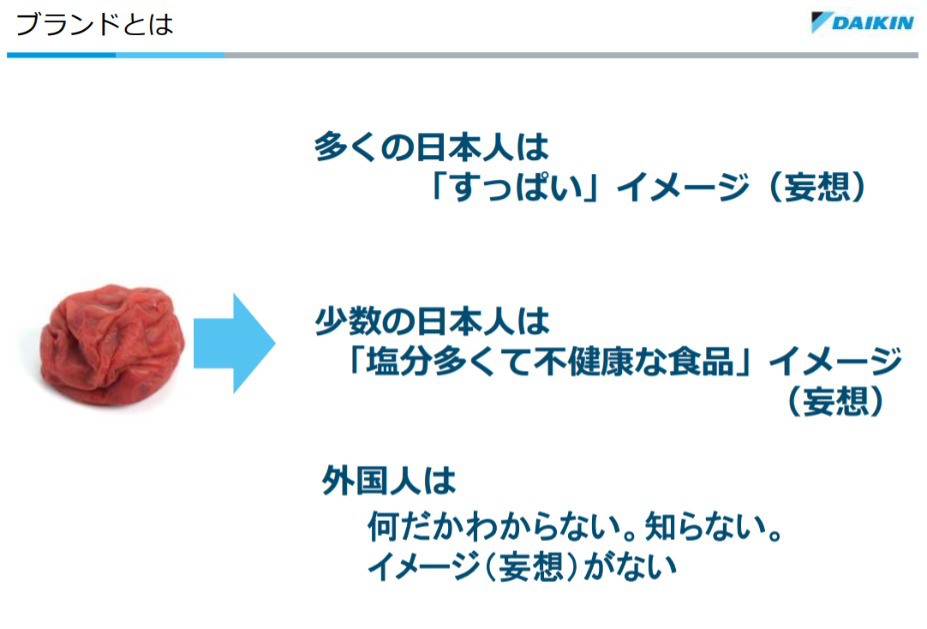 梅干し自身がブランドづくりを能動的にした訳ではないのに、日本人は梅干しをみて「酸っぱい」とイメージする。つまり「ブランドは自然にできる」。広告宣伝だけがブランドをつくる手段ではない。