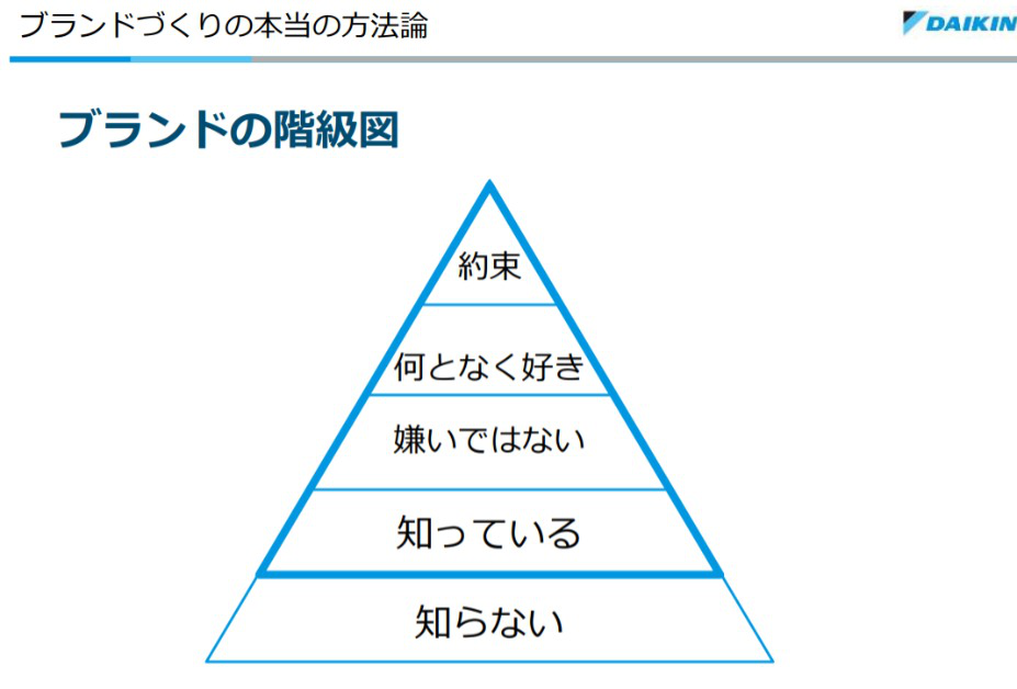 もちろん、5階級のうち「約束」レベルのブランドを確立できるのが理想だが、そこまで到達できている企業・商品は極めて稀だ。ほとんどの企業・製品は「知らない」レベルに留まっており、これは「ブランドではない」とほぼ同義である。だからこそ多くの企業は「知らない」を「知っている」に変える努力から始めることとなる。一足飛びで「何となく好き」を目指す必要はない。
