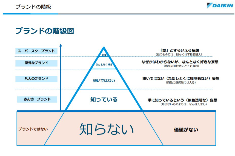 前提として、ブランドには5つの階層があると片山氏は説明する。ブランド価値が低い方から順に「知らない」「知っている」「嫌いではない」「何となく好き」「約束」があり、生活者ごとに程度は違うものの、「知っている」より後者はすでに何らかのブランドが存在する状態だとした。