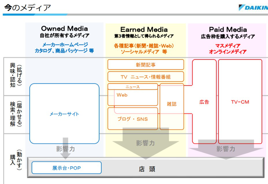 たとえばダイキン工業では、新型コロナ感染症流行のタイミングで、換気に関する情報をオウンドメディアで積極的に発信した。ただ、それだけではサイトへの流入は増えないため、アーンドメディアが掲載してくれるようにプレスリリースを発信したり、さらにはペイドメディアによる広告も組み合わせたり、統合型コミュニケーションの展開で上手くブランドを伝えていった。