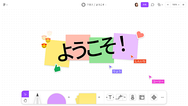 またオンライン上のホワイトボードである「FigJam(フィグジャム)」は付箋や絵文字をつけたり、図形や線も書き込めたりするなど、インタラクティブにブレストできる機能を持つツールである。