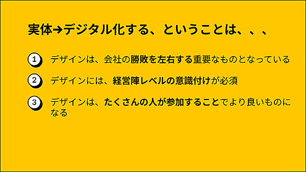 デザインは企業と顧客をつなぐ橋渡し役である。だからこそ、経営陣レベルからデザインの意識付けが必須だ。一般社員や社外のクリエイティブエージェンシーなども含め、多くの人たちが参加できるようになれば、デザインはもっと良いものになる(川延氏)