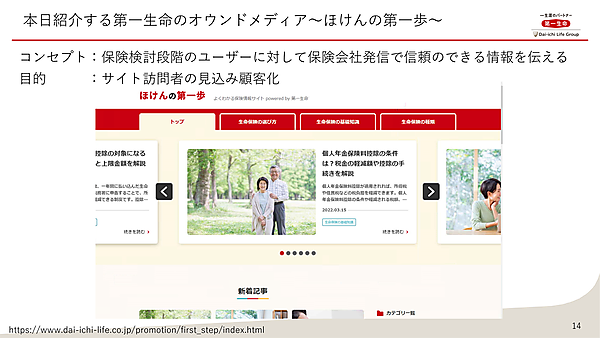 松村氏が立ち上げメンバーの一人として携わったのが、第一生命のオウンドメディア「ほけんの第一歩」だ。「ほけんの第一歩」は2021年3月末に公開され、保険検討段階のユーザーに対して、保険会社発信で「信頼できる情報を伝えること」をコンセプトとしている。目的は「サイト訪問者の見込み顧客化」で、月数本のペースで記事を公開しているという。