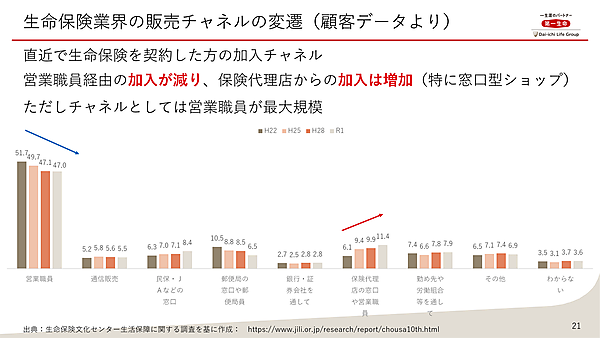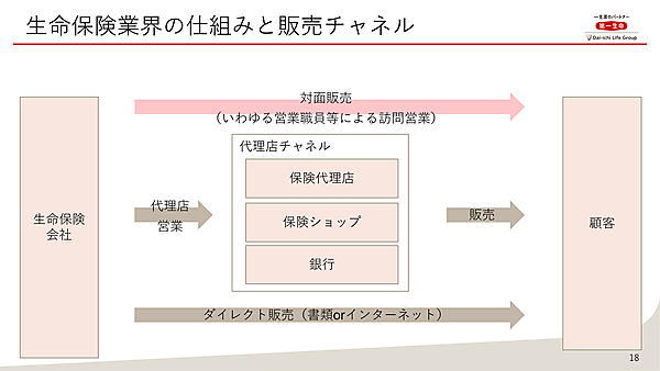 では、第一生命はなぜオウンドメディア施策に代表される、デジタルマーケティングに力をいれるようになったのか? 松村氏は生命保険業界の仕組みと販売チャネルの変遷について説明をした。