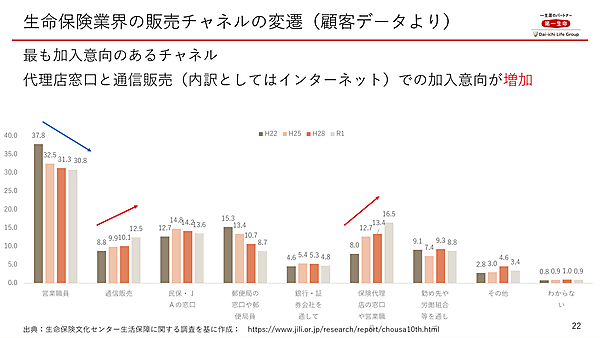 また同調査でどのチャネルを通じて保険に加入したいかという調査では、加入意向が増加しているのは代理店窓口と通信販売(主にインターネット)だった。