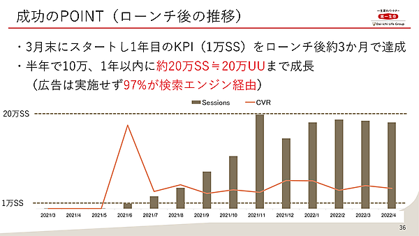 半年後には月間10万セッション、1年後には同20万セッションの規模に成長した。集客のための広告は実施せず、流入の97%が検索エンジン経由だ。松村氏は“プチ成功”とでも言うべき手応えを得ている。