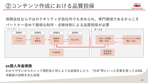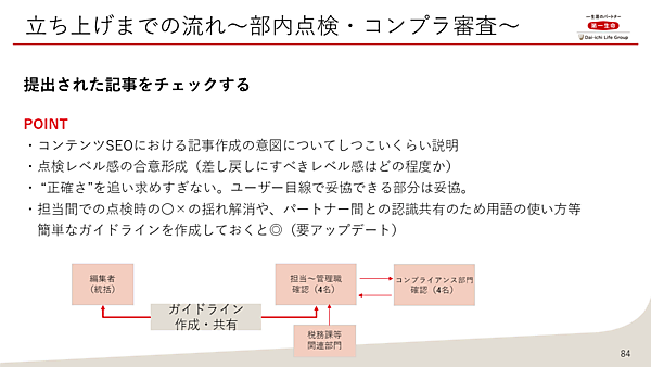 SEOで優位になるポテンシャルがあるからといって、単にコンテンツを作成して発信すればよいかというとそう簡単な話ではない。それはあくまで高クオリティなコンテンツがあってこその話だ。成功のポイントの2つ目はコンテンツの品質担保だ。「保険会社が発信するゆえに、高いクオリティが社内でも求められており、専門領域であるからこそ厳格な制作・点検体制による品質担保が必要だった」と松村氏。