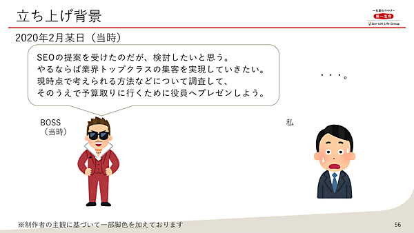 ではなぜそんな松村氏がオウンドメディアを立ち上げることになったのか。2020年2月頃、上司から突然「SEOの提案を受けたのだが、検討したい。やるならば業界トップクラスの集客を実現したいので……」と、“無茶振り”をされたという。