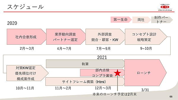 続いて松村氏は、「私がやってしまった失敗をしないために、これからオウンドメディアを立ち上げたり、コンテンツSEOを実施したりする方の参考にして欲しい」と想定外の事だらけだったという、「ほけんの第一歩」立ち上げまでの流れとスケジュールを紹介した。以下は、「ほけんの第一歩」がオープンするまでの1年間をまとめた図である。当初の予定では2021年2月末公開予定であったが、1カ月延期して3月末に公開となった。