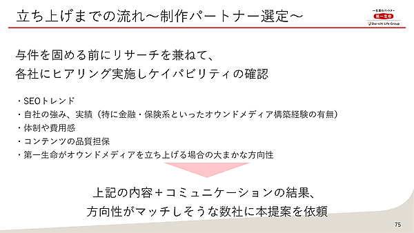 どの制作パートナーを選ぶかは、各社の状況・業界事情によっても異なり、正解はない。第一生命の場合はコンプライアンスの優先度が特に高いが、会社固有の事情を理解し、現実的なプランを組み立て、伴走してくれそうなパートナーを選ぶのがベストではないかと松村氏は述べた。