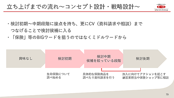 続いてはコンセプト設計・戦略設計についてだ。「ほけんの第一歩」は、検討初期から中期(候補を絞っている段階)の見込み客とコンテンツで接点を持ち、さらに資料請求や相談といったCVにつなげることで第一生命が検討候補に入ることを狙いとした。キーワードは「保険」といったビッグワードを狙うのではなく、ミドルワードから着手することを戦略とした。