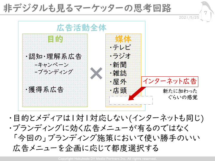 非デジタルも経験しているマーケターにとって、店頭やテレビ、新聞などの施策は「広告活動全体の目的」に基づくものであり、インターネット広告もその1つに過ぎない。だからこそ、目的とメディアは必ずしも1対1ではなく、「ブランディングという目的のために企画に応じて都度メディアを選択する」のが非デジタル系マーケターの一般的な考え方だ。