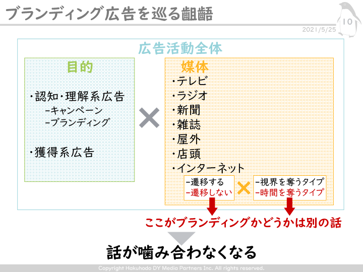 その結果、デジタルマーケティングの営業は、「ブランディングをするのであれば動画広告」と話すようになるが、非デジタルを経験しているマーケターには違和感があるというわけだ。