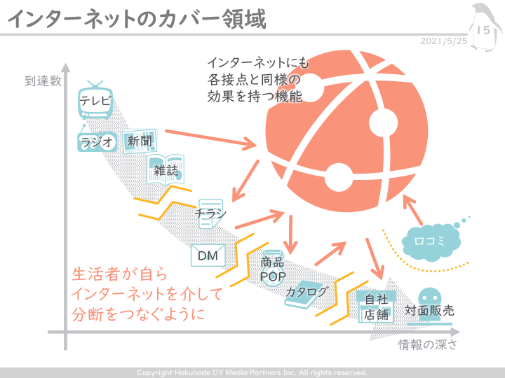 そこにインターネットが登場。初期には広告メニューの1つに過ぎなかったが、やがて領域が拡大したことで、生活者がインターネットを介して分断をつなぐような行動をとるようになった。企業側もそれを促進するようになり、その結果、インターネットのカバー領域が増えて、今やデジタルを使わないマーケティングはありえない時代となっている。
