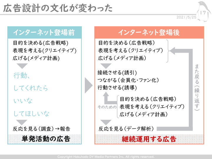 インターネット登場前の広告は「そこにいる生活者に何を知らせるか」しか考えていなかったといえる。企業からみれば生活者は受け手でしかなく、目的・戦略決定から、表現やメディア計画なども決めて実行し、その後は受け手の反応をみるという、いわば単発活動の広告だった。
