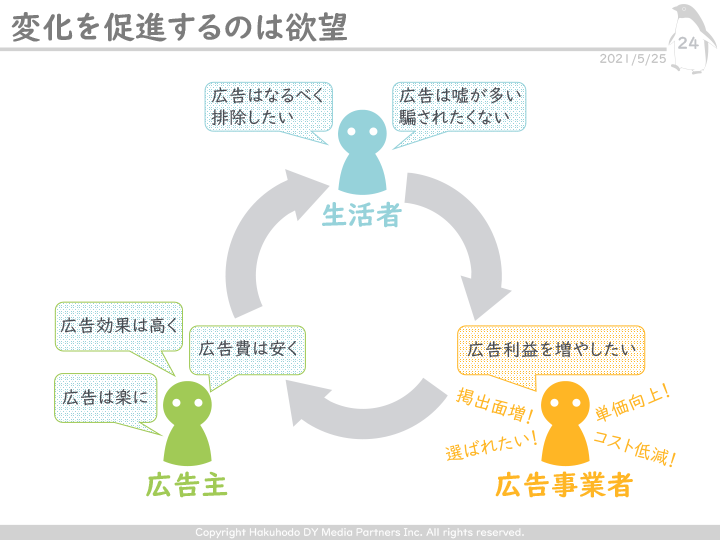 あくまで変化を促進するのは「人」であり、それも生活者、広告主、広告事業者がそれぞれ抱く“相反する思い”が影響していることは間違いない。「広告に騙されたくない」「排除したい」という生活者、「安く楽に広告効果を上げたい」という広告主、そして広告事業者は「広告利益を増やしたい」と考え、単価向上やコスト削減に邁進する。そうしたそれぞれの「欲望」に対して技術が進化してきたというわけだ。