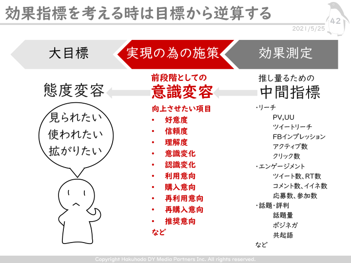 次図にあるように、まず必要なのは生活者に「使われたい」「拡がってほしい」といった「このように態度変容をしてほしい」という大目標になる。そして、生活者の意識に働きかけて変化を起こさせる「意識変容」がその大目標に対する成果指標となる。