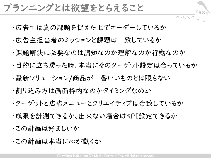 常に目的と手段は入れ替わりがちだ。たとえば、デジタルだからといってコンバージョンが目標とならなくてもいい。デジタルだからといって若い人がターゲットでなくてもいいし、目の前にある最新のデジタル施策が自分たちの商品に合っているとは限らないのだ。ターゲットと広告メニューとクリエイティブは合致しているか、成果を計測できるか、できない場合はKPIを設定できるかなど、「本質」を捉えるための問いはさまざまだ。