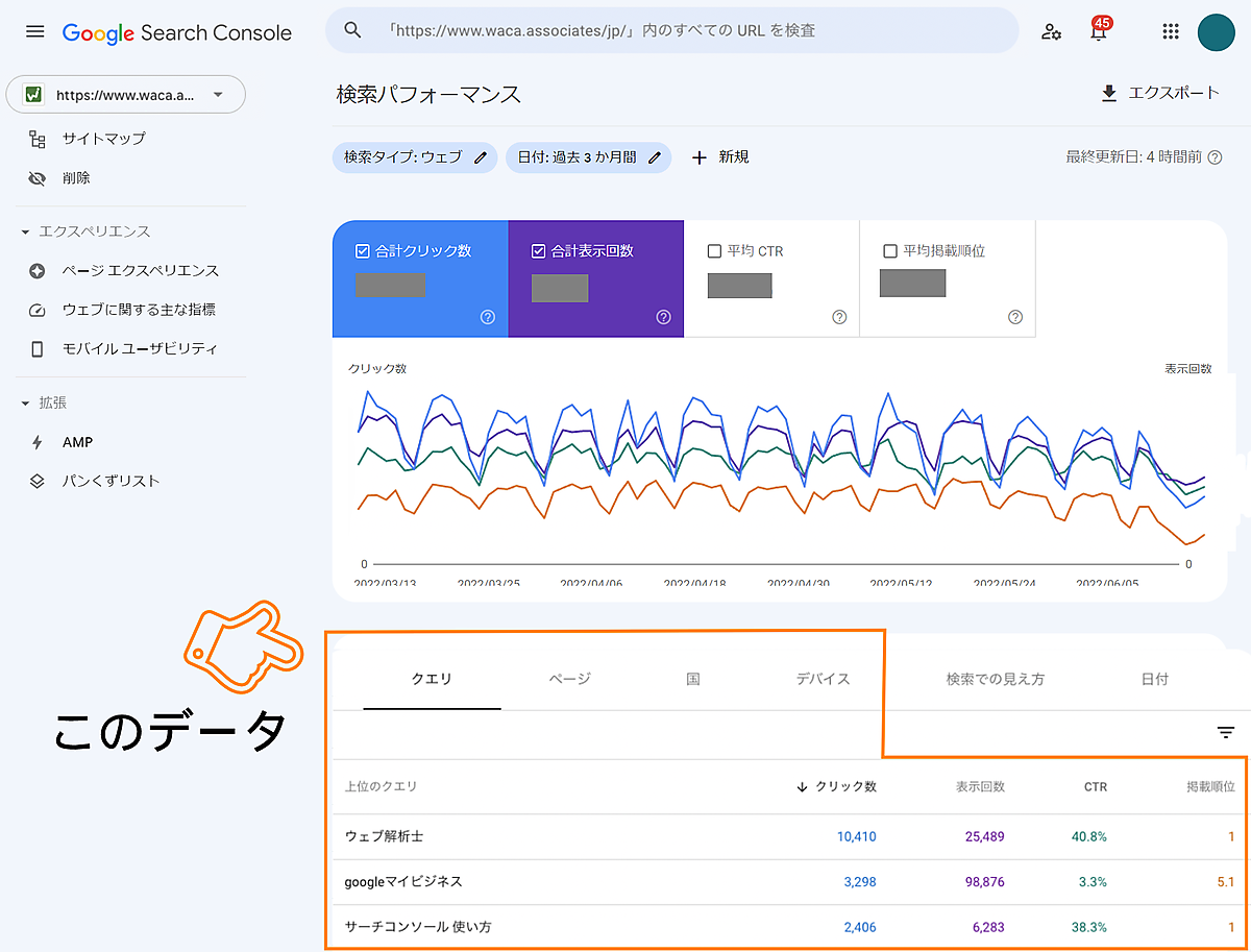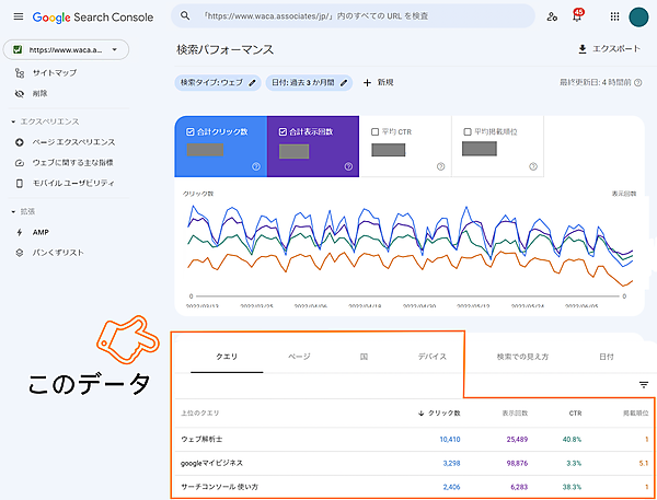 | 表示回数 | WebサイトへのリンクがGoogle検索結果で見られた数 | |