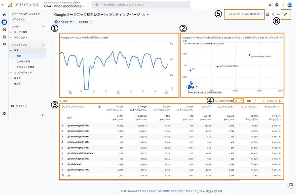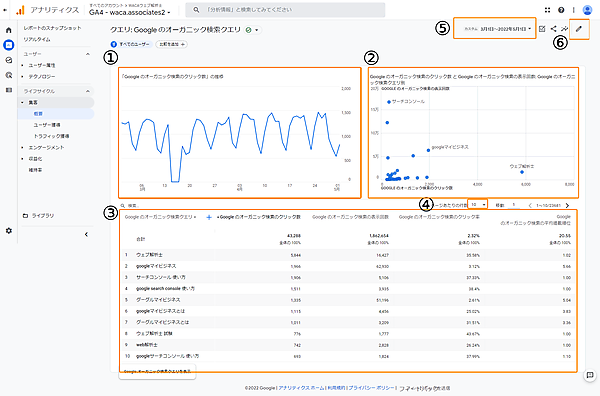 (1)と(2)のグラフを[棒グラフ][折れ線グラフ][散布図]に変更できます。レポートのディメンションの変更や追加はできません。指標は[Googleのオーガニック検索のクリック数][Googleのオーガニック検索の表示回数][Googleのオーガニック検索のクリック率][Googleのオーガニック検索の平均掲載順位][ユーザー数][エンゲージメントのあったセッション数][エンゲージ率][平均エンゲージメント時間][イベント数][コンバージョン][広告収益]のなかから選択可能です。