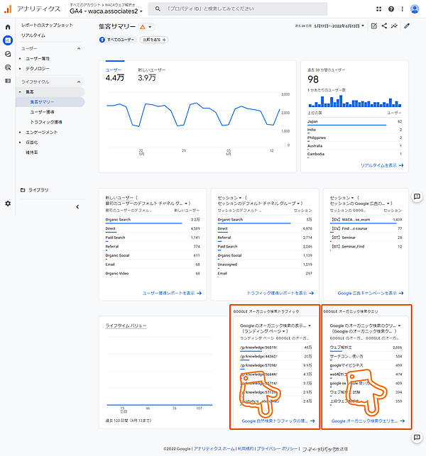 上記2つのレポートは、GA4ナビゲーション[ライフサイクル]>[集客]>[集客サマリー]に、それぞれのレポートへのリンクが用意されています。