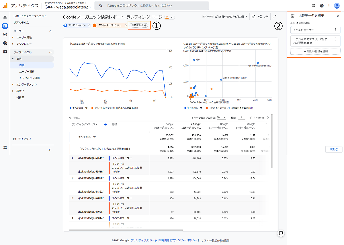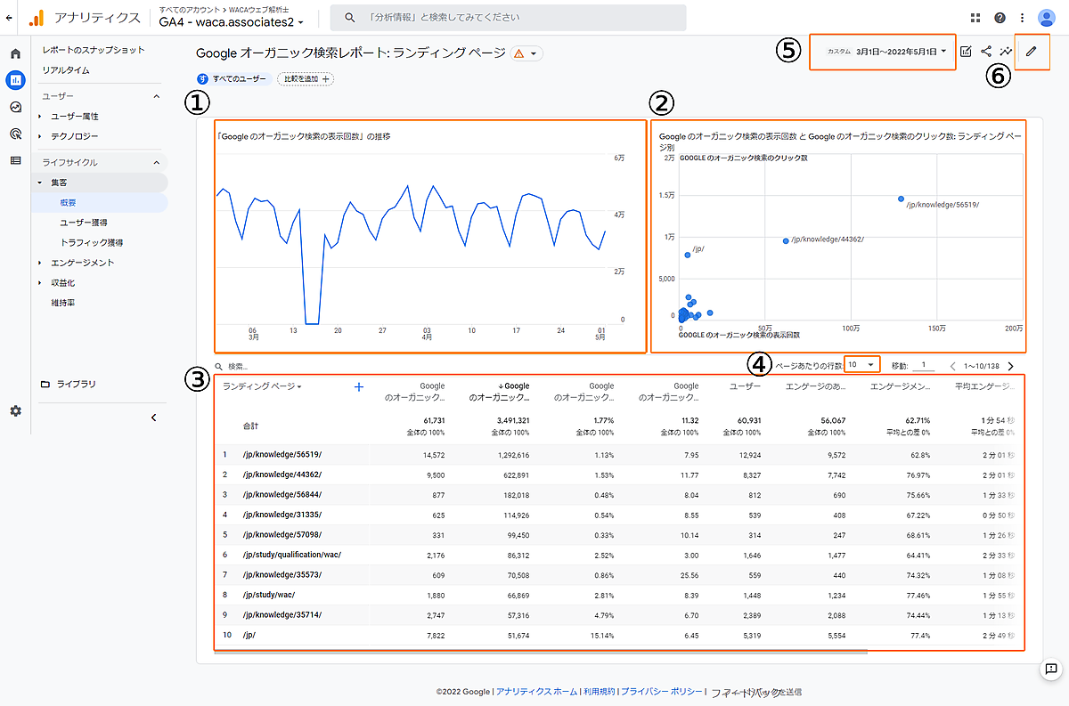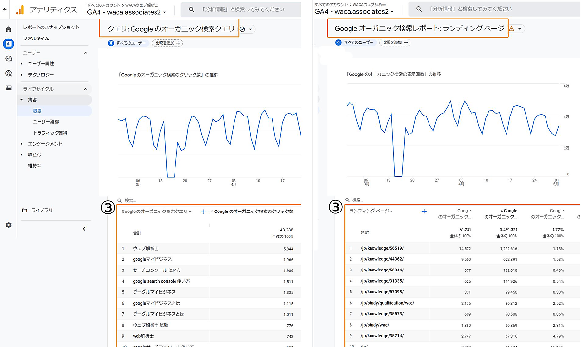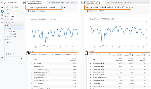 (2)Googleのオーガニック検索のクリック数 とGoogleのオーガニック検索の表示回数:ランディング ページ別