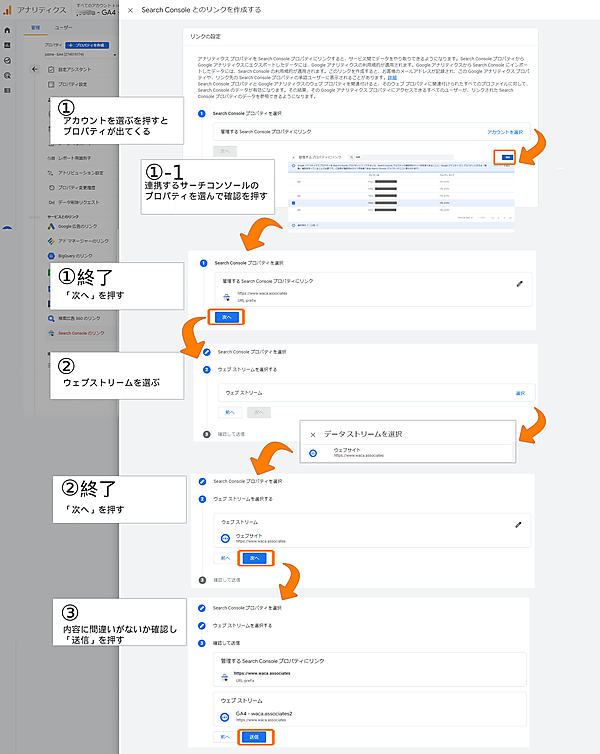 - ウェブデータ ストリームは、1つのサーチコンソールにのみリンクできます。そのため、すでに他のサーチコンソールがリンクされている場合は、追加や上書きリンクはできません。一度既存のリンクを削除してから再度連携作業を行ってください。