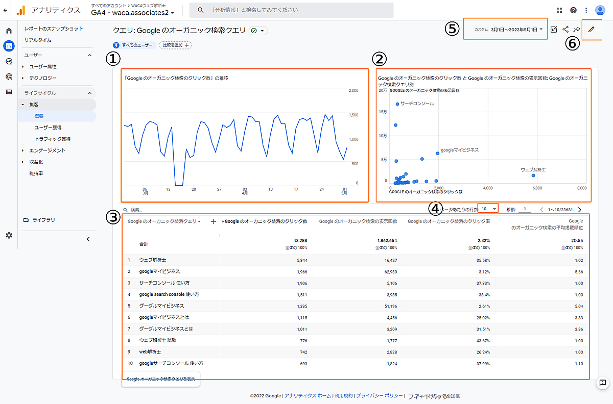 (2)Googleのオーガニック検索のクリック数とGoogleのオーガニック検索の表示回数:Googleのオーガニック検索クエリ別