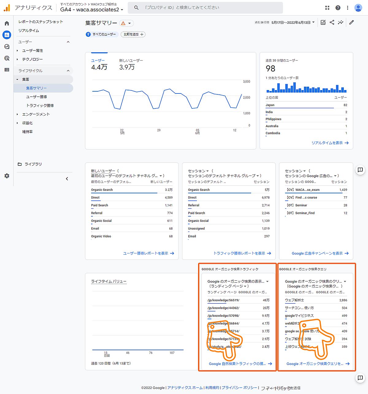 - 連携すると、GA4上でもサーチコンソールのデータが確認できる