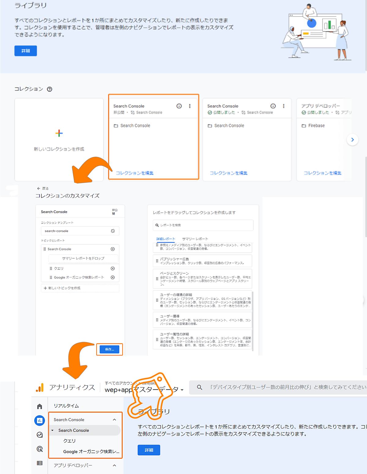 このサーチコンソールのレポートはデフォルトが非公開となっているため、ナビゲーションには出ていません。そのため毎回[ライフサイクル]>[集客サマリー]から確認しなければならないのがとても面倒です。そんなときには、ナビゲーションに常時レポートを表示させる技があります。[ライブラリ]>[コレクションの作成]機能で簡単に操作できます。