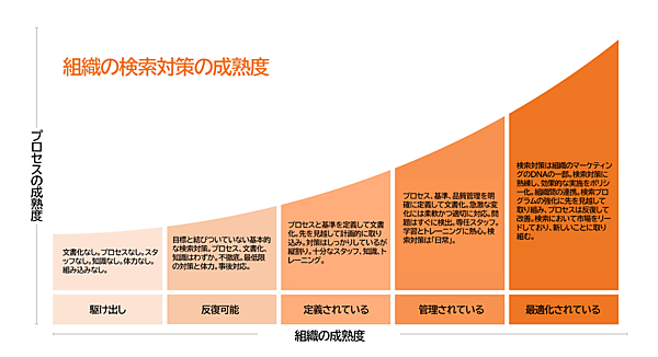 組織の検索対策における成熟度を評価すると、成果を手にするためには、まず組織の内部でなにを解決する必要があるのかがわかるだろう。これに前編に取り上げたテクニカルな能力成熟度を組み合わせると、組織の力になるための強力な知識とツールが手に入る。