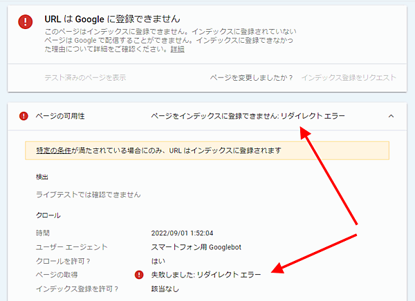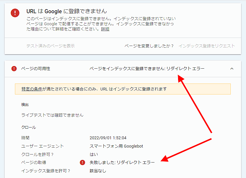しかし実際にSearch ConsoleのURL検査でテストしてみたところ、リダイレクト5回までは問題なく処理され、リダイレクト6回では「リダイレクト エラー」となり処理されなかった(リダイレクトはすべて同一サイト内でテスト、301・302ともに同じ結果)。