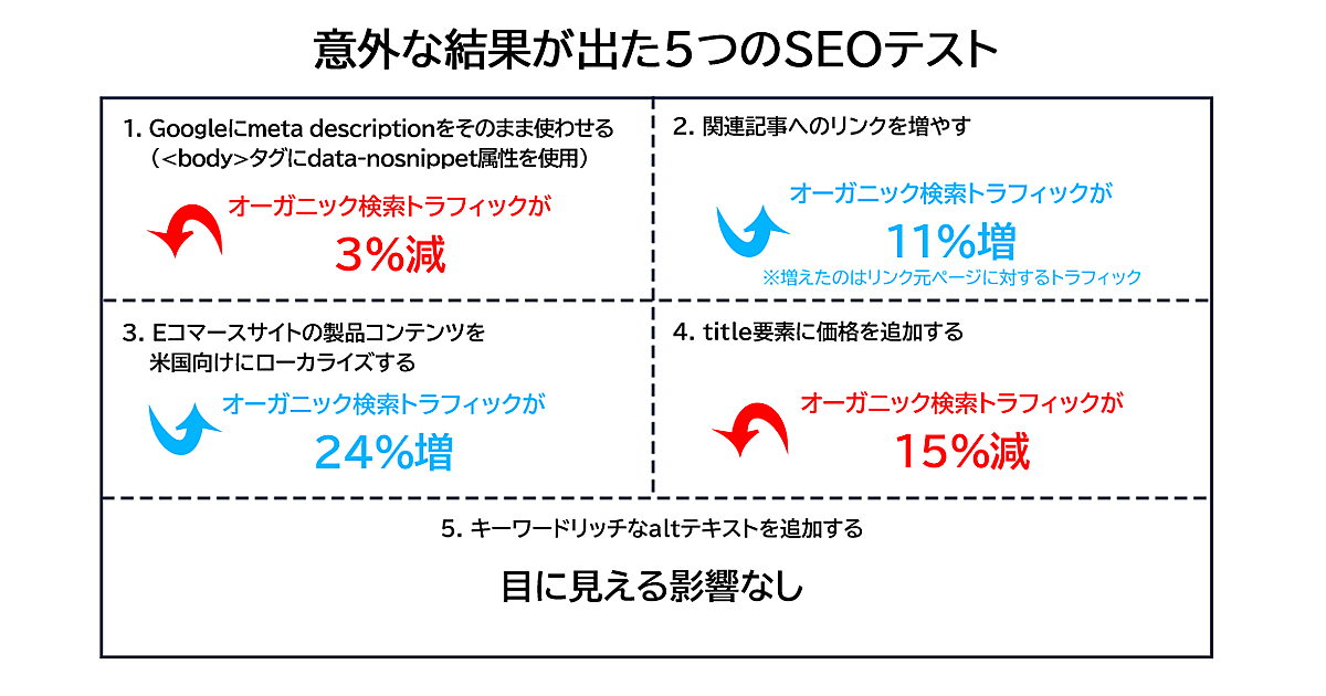 SEOに悩む方は、ベストプラクティスのはずのテストがオーガニック検索トラフィックを低下させたり、ちょっとテスト的にやってみただけのことが成功につながったりするなど、さまざまなケースを経験したことがあるだろう。