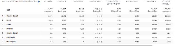 | デフォルトチャンネルグループ | デフォルトとなる各チャンネルのトラフィック 例:Organic Search,Display,Direct |