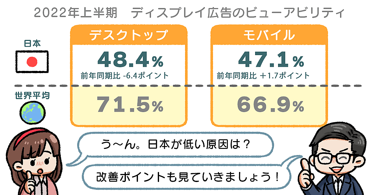 そして同調査では、ついに日本がビューアビリティが50%を切る、世界で唯一の市場になったことが明らかになりました。デスクトップでは48.4%、モバイルでも47.1%と、実に半数以上の広告が「見られる状態」にないまま配信されている結果は、日本の広告業界における低ビューアビリティの深刻さを浮き彫りにしています。