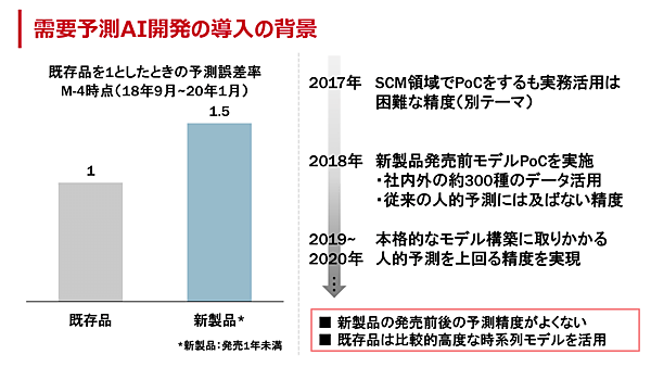 需要予測AI開発に取り組む前は、既存品を1としたときの新製品の予測誤差率が1.5で、新製品の予測精度は高くなかった。そこで、ビジネス的なインパクトの大きい新製品の需要予測に取り組むことになった。